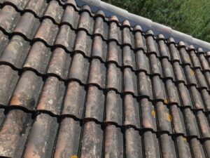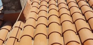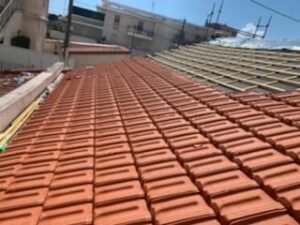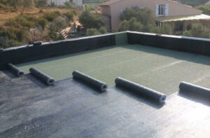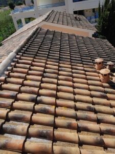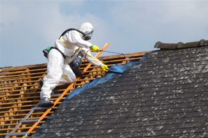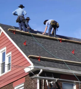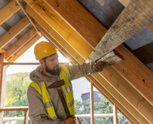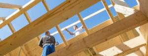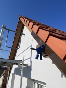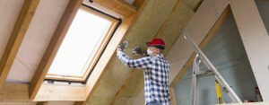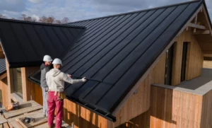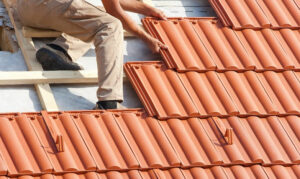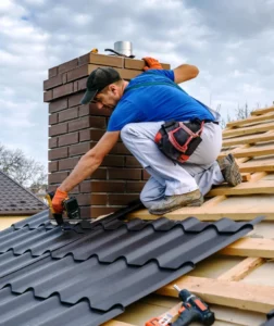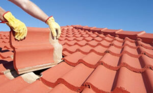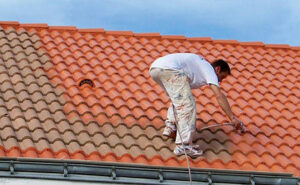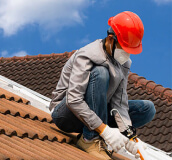 Technician man hand using glue gun with silicone adhesive or manual caulking gun with polyurethane to seal the leak on the roof. Installing and building construction concept.